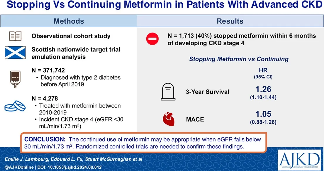 Comparou 4.278 pacientes com DRC 4 que continuaram ou pararam metformina.